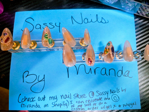all available, I can recreate my set or make you a custom set,you always pick nail shape,length,and color!!!! I do tips with gel x and polygel. I am available for birthday parties,baby showers, Bridal showers,weddings,gender reveals, girls nights,and other events! Shipping is available!Contact: